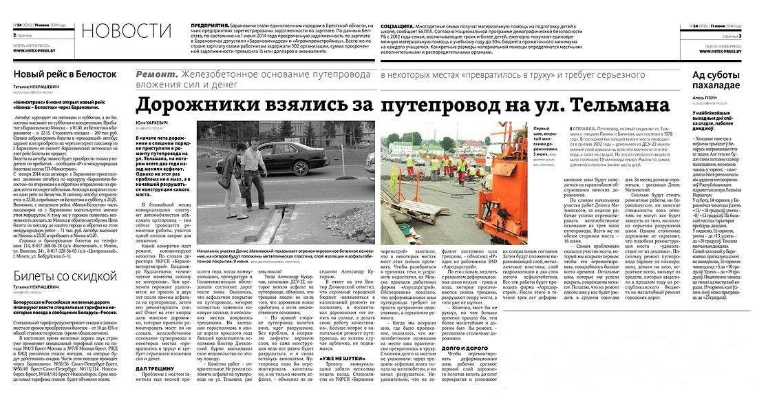 Тревогу коммунальщики забили несколько недель назад. Специалисты из УКРСП «Барановичиремстрой» заметили, что в некоторых местах мост стал сильно протекать. Чтобы разобраться в причинах течи и устранить недостатки, из Минска приехали работники фирмы «АЭРОДОРСТРОЙ». Обследование показало, что деформационные швы путепровода требуют не просто «устранения недостатков», а серьезного ремонта.