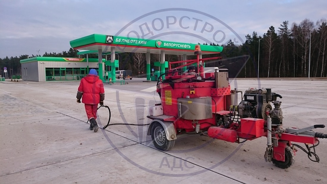 При строительстве автозаправочной станции в Гродненском районе бетонное покрытие было уложено на площади около 15000 кв.м. толщиной 22см. В соответствии с техническими были устроены швы сжатия и расширения общей протяженностью более 5,5 тысяч метров.