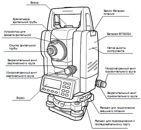 К основным составляющим частям тахеометра относится: зрительная труба, корпус, вычислительный блок с клавиатурой и дисплеем.