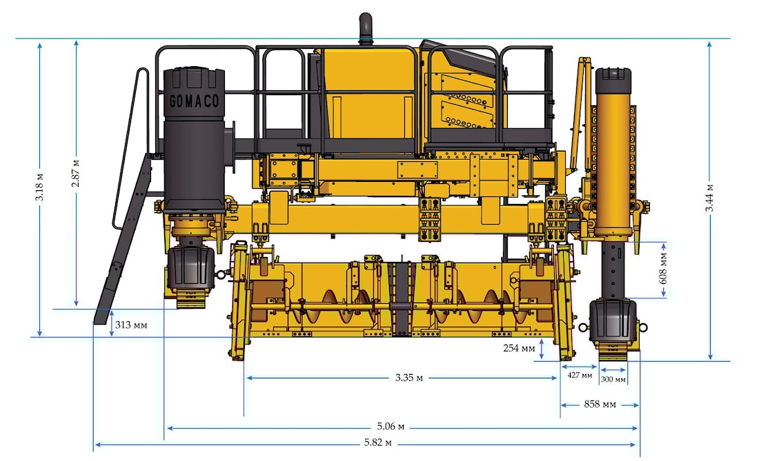 Бетоноукладчик Gomaco COMMANDER III – это самоходная машина, предназначенная для дозирования, распределения и укладки бетонной смеси на различных строительных объекта. Бетоноукладочный комплекс чаще всего применяется для устройства покрытий бетонных дорог, площадок и строительства бетонных тротуаров Подвижная конструкция позволяет бетоноукладчику во время производственного процесса перемещаться по ходу, либо против направления движения дорожного транспорта. Ходовая часть представлена четырьмя гусеницами, что в свою очередь способствует высокой маневренности машины.