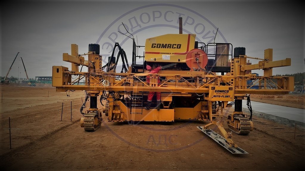 На своих объектах для укладки верхнего слоя бетона мы задействуем тяжелые секционные виброрейки и цилиндрические катки, бетоноукладчики : GOMACO Commander III и GOMACO GHP-2800, позволяющие укладывать в смену до 500м3 смеси. Данное оборудование используется для укладки покрытий шириной до 9,75 м и толщиной слоя до 50см. Также мы собственными силами выполняем работу по нарезке и герметизации деформационных швов в уложенном бетоне и гидрофобизации поверхности.