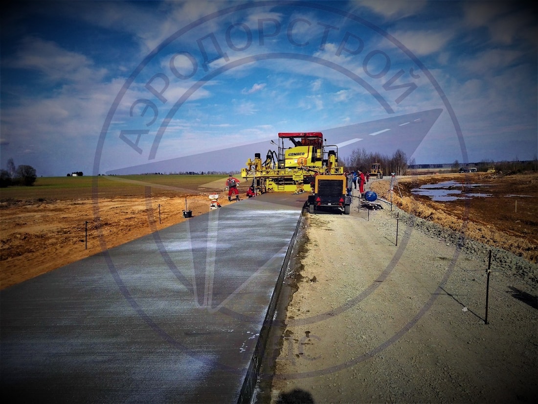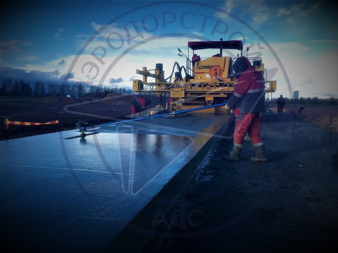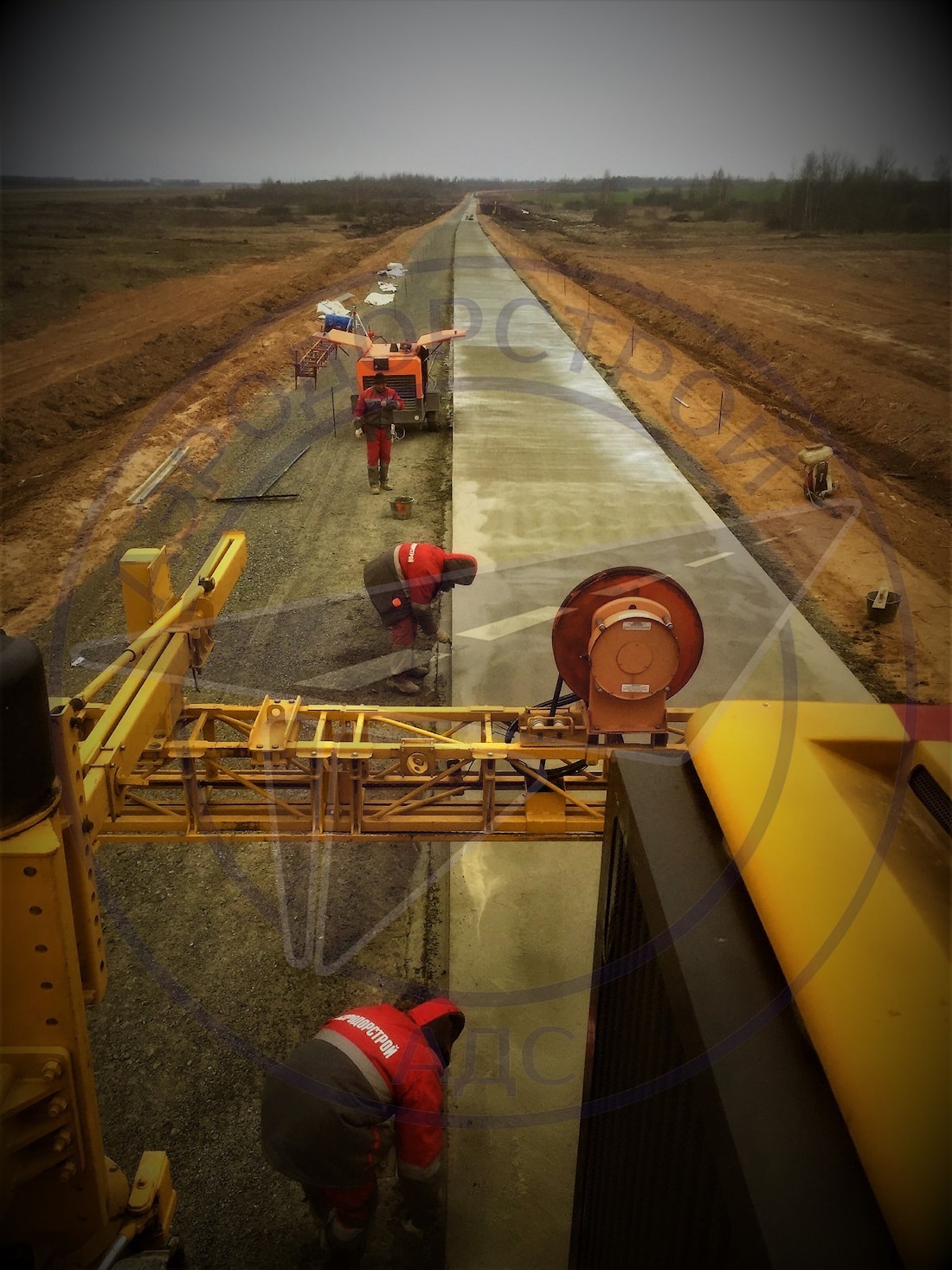 При строительстве цементобетонного покрытия дороги было уложено 3500 м3 бетона, толщина слоя составила 24 см. Были устроены продольные и поперечные швы сжатия общей протяженностью порядка 5 км. Предварительно в ходе бетонирования было выполнено армирование штырями («дюбелями») продольных и поперечных швов из гладкой арматуры диаметром 18 мм. Свежеуложенная поверхность , сразу после придания ей шероховатости текстуровщиком , была обработана пленкообразующим материалом, что позволило избежать усадочных трещин в сложных климатических условиях ( температура воздуха до +30°С)