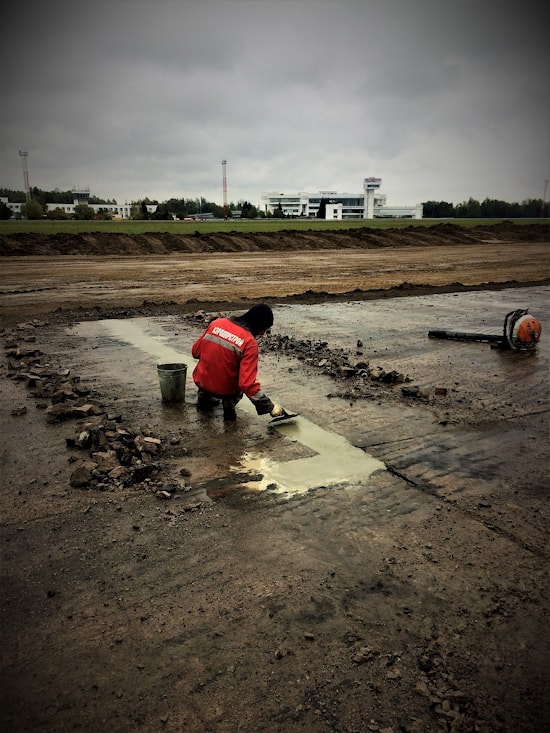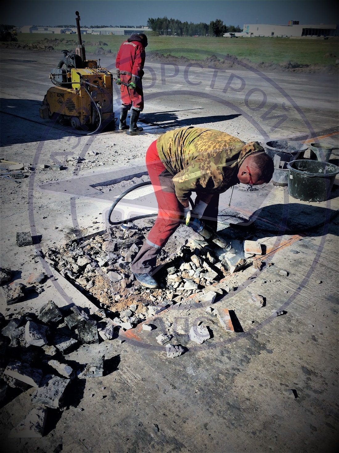 Ямочный ремонт цементобетонного покрытия аэродромных плит в количестве 490 м2 при помощи высокопрочных быстротвердеющих ремонтных составов Emaco. Из них 240 м2 были выполнены на ИВПП в условиях работы во временных окнах (время между вылетами и посадками воздушных судов и 250 м2 на перроне и рулёжной дорожке. -