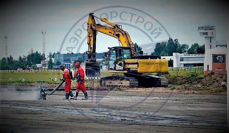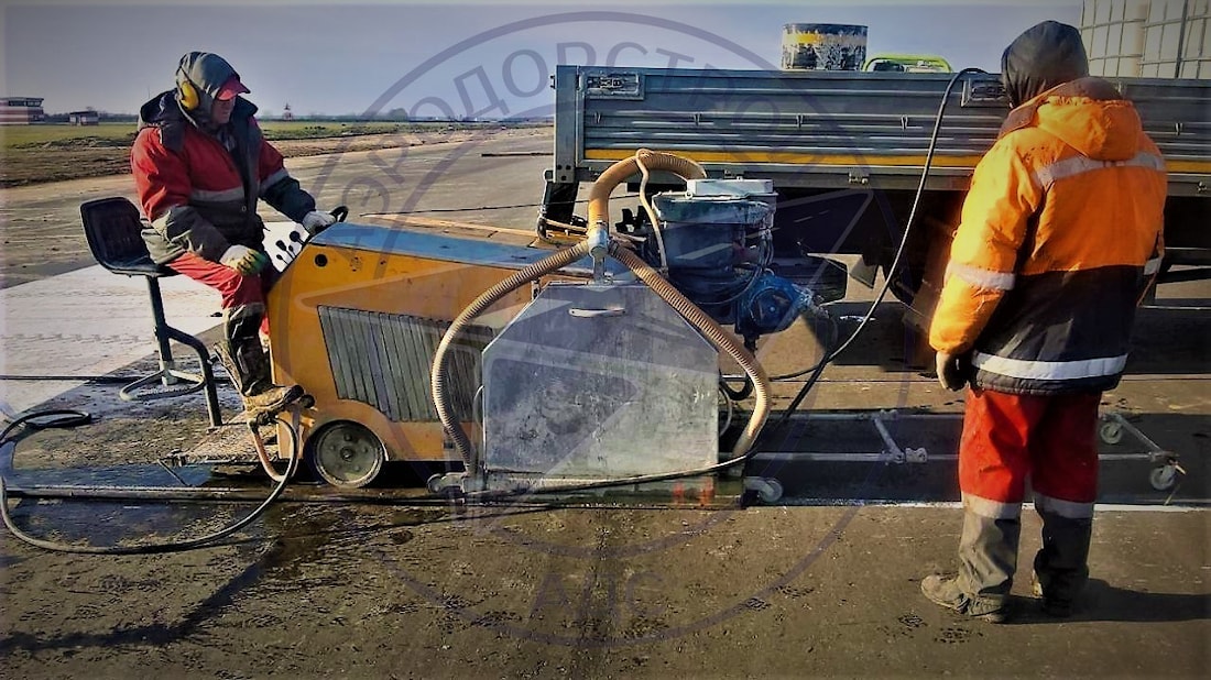 Нарезка и последующая герметизация швов в новом свежеуложенном асфальтобетонном покрытии действующей взлетной полосы, РД и перрона количеством более 35 км. Глубина нарезки составляла 26 см. -