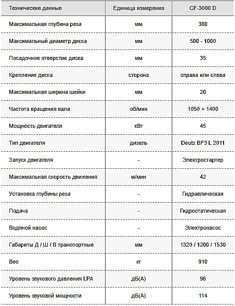 Конструкция нарезчика позволяет устанавливать алмазный диск диаметром до 1000 мм, тем самым глубина реза составляет до 38 см.При этом на нарезчик CF 3000 возможно установить дополнительное откачивающее приспособление обеспечивающее сбор образующихся при резке шлама и грязи.