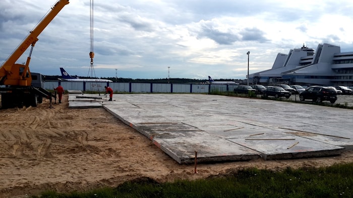 На начальном этапе строительства силами нашей компании был выполнен комплекс работ по демонтажу 35 тыс.м2 покрытия толщиной до 50 см на площадке МС-36. В процессе производства работ производилась нарезка бетонного покрытия на карты 2х3 м ,для этого применялись мощные нарезчики швов оборудованные алмазными дисками 450х1200 мм. Далее производился демонтаж нарезанного покрытия с применением вилочных погрузчиком и автокранов. В последствии из демонтированных плит была устроена стоянка автотранспорта возле здания аэровокзала.