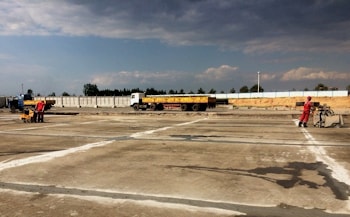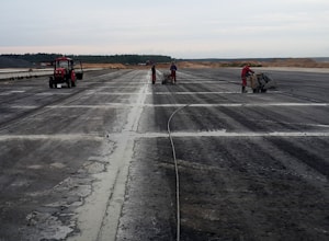 Далее силами нашей компании производились работы по нарезке слоя основания из бетона В12.5 на возводимой ИВПП, РД и перронах. Работы проводились в сжатый срок из-за необходимости укладки тяжелого бетона на нарезанное нами основание. В общей сложности на всей застраиваемой и реконструируемой территории нами было нарезано около 35 км шва и устроено около 4 км шва расширения в "тощем" бетоне.
