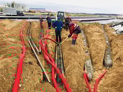 Одним из видов работ, производимых ЗАО АЭРОДОРСТРОЙ стало устройство ССО. Работы включали себя прокладку труб в слое основания из тощего бетона (около 10 км), прокладку труб в грунтовой обочине(более 12 км), сверление отверстий в бетоне (около 300 отв.), протяжку кабелей в трубы, монтаж колодцев ССО в обочине, монтаж проблесковых огней в устроенные отверстия. В процессе производства работ нами были задействованы средства малой механизации, экскаваторы, швонарезчики, передвижные компрессоры и другое оборудование.