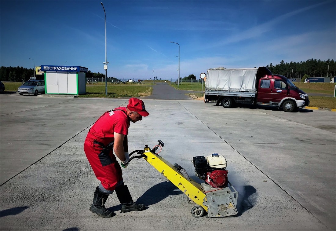 Перед нанесением гидрофобизирующего состава необходимо предварительно подготовить цементобетонную поверхность : произвести ремонт трещин, пор, каверн с последующей шлифовкой покрытия. Шлифовка покрытия необходима для обнажения минерального заполнителя (щебня и крупного песка). Хорошо текстурированная поверхность после шлифования обеспечит лучше проникание состава Saniseal в тело бетона. По завершении шлифования необходимо произвести водоструйную очистку поверхности.
