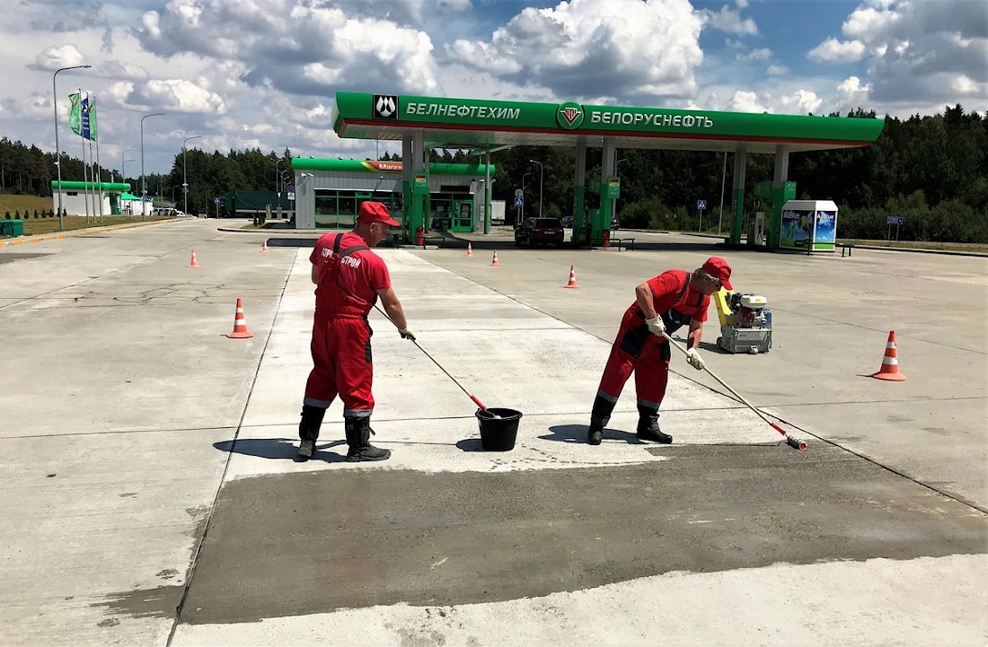 - препятствует проникновению в бетон солей, хлоридов, сульфатов, фосфатов, масел, растворителей и образует твердое пыленепроницаемое покрытие;
