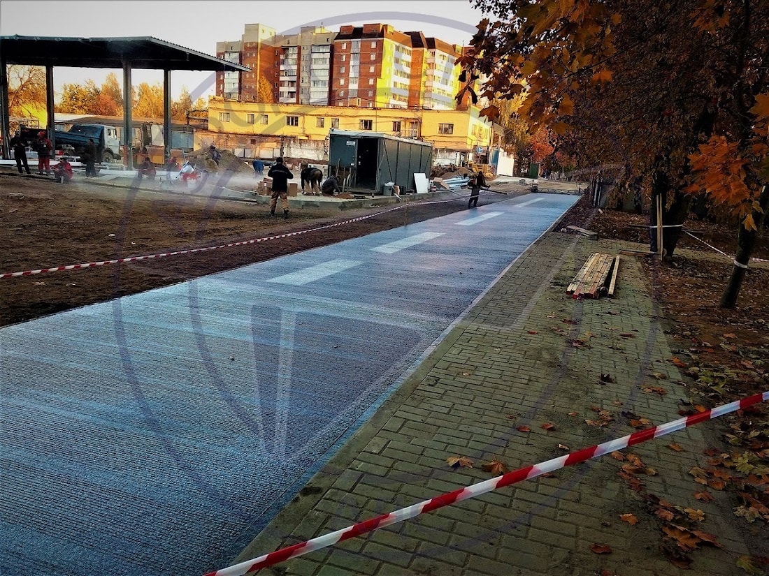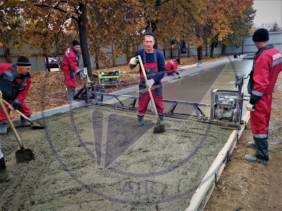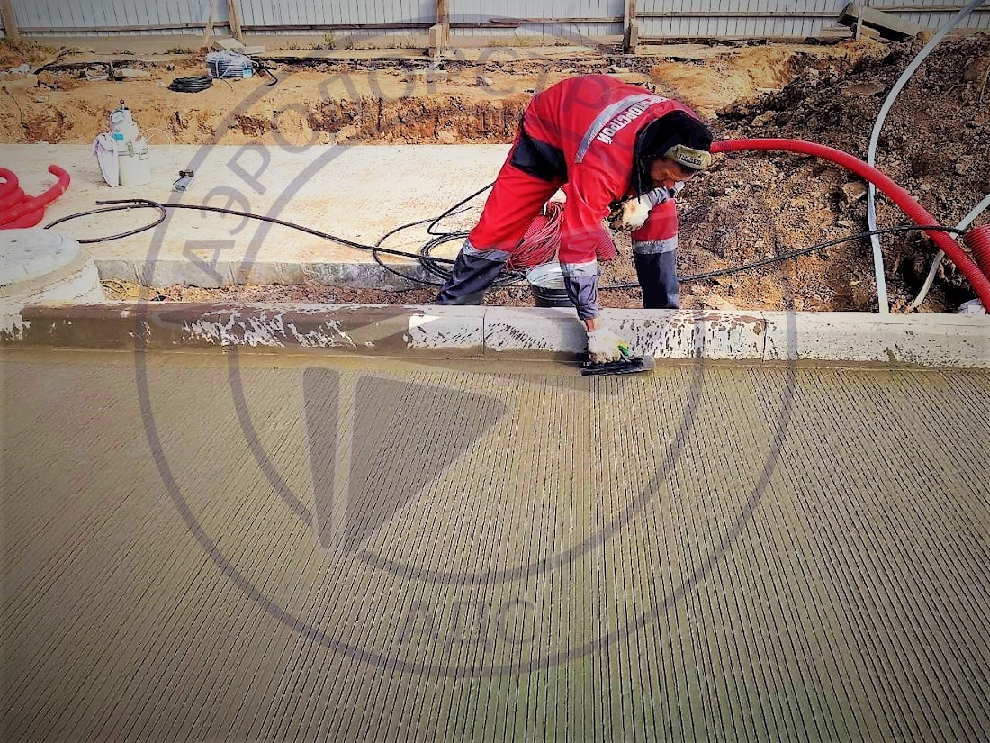 Цементобетонное покрытие было выполнено из бетона класса В30 Btb 4.0 F 200 толщиной слоя от 18 до 20 см. Общая площадь устроенного покрытия составила 2500 м2. Бетонирование осуществлялось посредством секционных виброреек. Буквально за неделю была смонтирована опалубка и принят весь объём необходимого бетона. На устроенном покрытии согласно проекту были нарезаны швы сжатия, расширения и примыкания к бортовому камню. Герметизацию швов выполняли с применением мастики BIGUMA TL 82 и уплотнительного шнура NOMATEC Backer Rod.