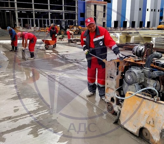 Работы по нарезке швов производились с применением высокопроизводительных швонарезчиков Cedima и Lissmac и средств малой механизации (машина щёточная, фасочная и др.)