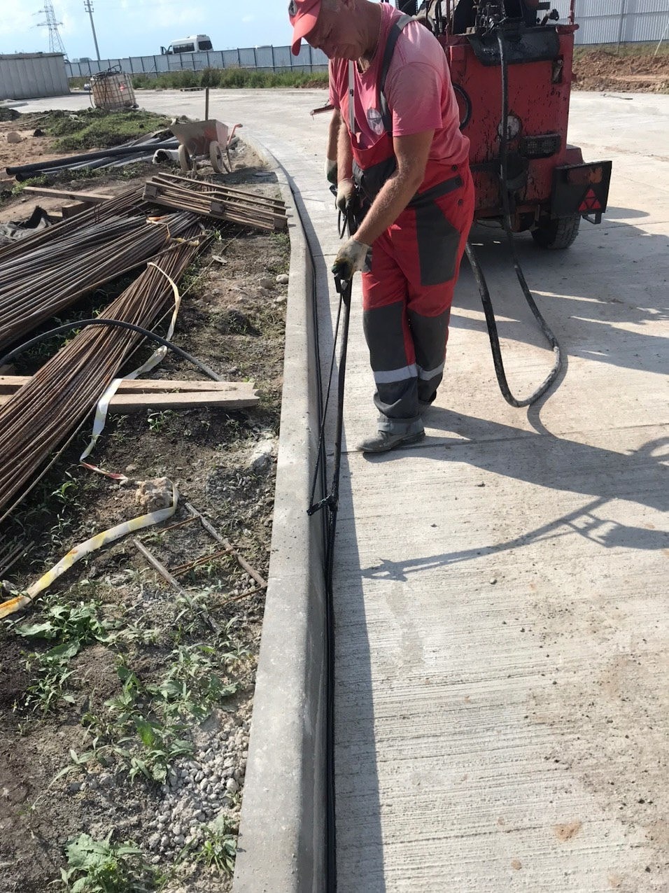Герметизация данных швов выполняется с применением битумных мастик. Перед герметизацией устраивается фаска с одной стороны, камера шва очищается от пыли, грязи остатков бетона, излишков ленты с помощью щёточной машины. Укладывается термостойкий уплотнительный шнур и производится грунтование поверхности для лучшей адгезии. Устройство швов вдоль борта продлит ресурс вашему покрытию и сэкономит ваши деньги в будущем от ненужного ремонта.