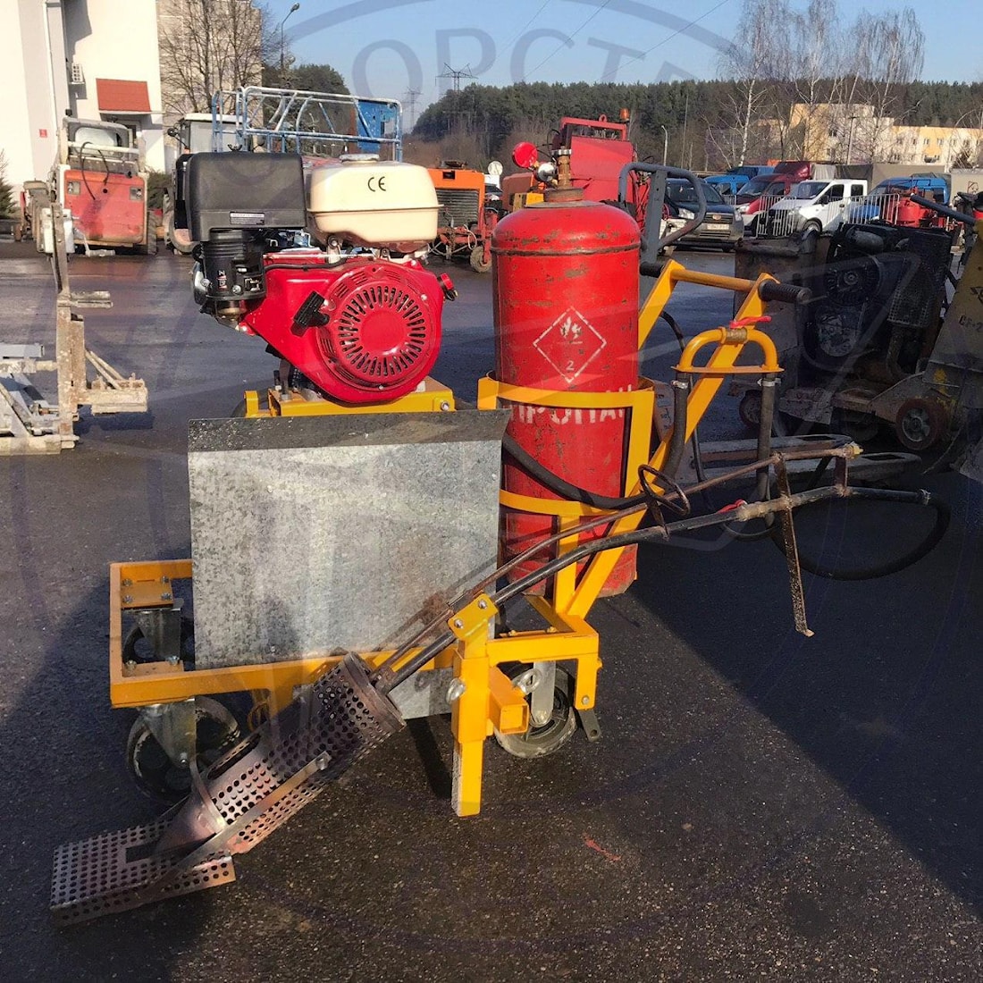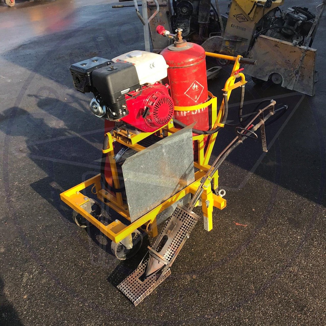 Автономное тепловое копьё Meco - это мобильная передвижная установка, используемая для просушки и очистки деформационных швов и трещин в цементобетонных и асфальтобетонных покрытиях дорог, аэродромов, мостовых и гидротехнических сооружениях. Терможало Meco оборудовано газовоздушной пропановой горелкой и воздушным компрессором, что обеспечивает высокую производительность и эффективность в работе. В комплект аппарата горячего воздуха входят следующие элементы : передвижная стальная рама на 4 колёсах, компрессор, выдающий рабочее давление до 0,6 бар, непосредственное само копьё, газовые шланги и баллон с пропаном 50 литров, двигатель и редуктор с манометром . В результате работы газовоздушная смесь разогревается до температуры 300° С , что позволяет при воздействие на шов, удалить из него все излишки влаги и очистить камеру от загрязнений.