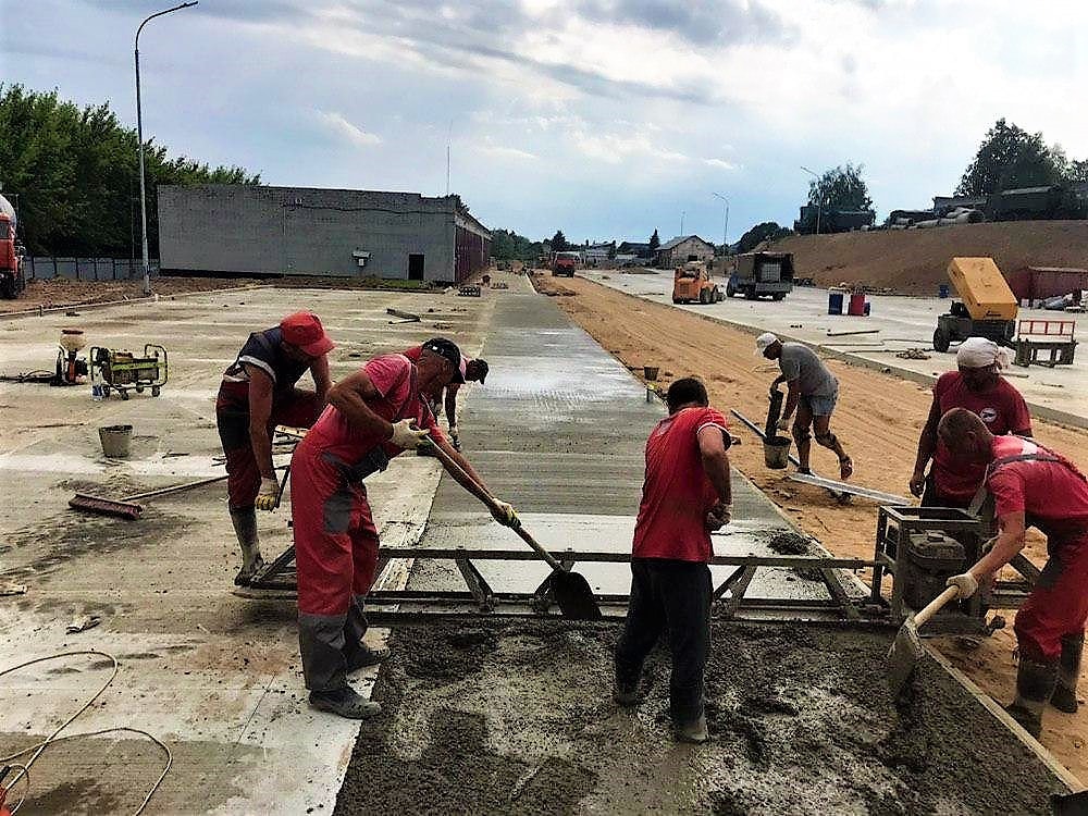 Силами наших специалистом было устроено 7200 м2 новых цементобетонных покрытий. На объекте использовался бетон B25 П2 W6 F200. Слой покрытия составил 18 см, также было предусмотрено продольное штыревое соединение смежных плит арматурой диаметра 18 мм S240.
