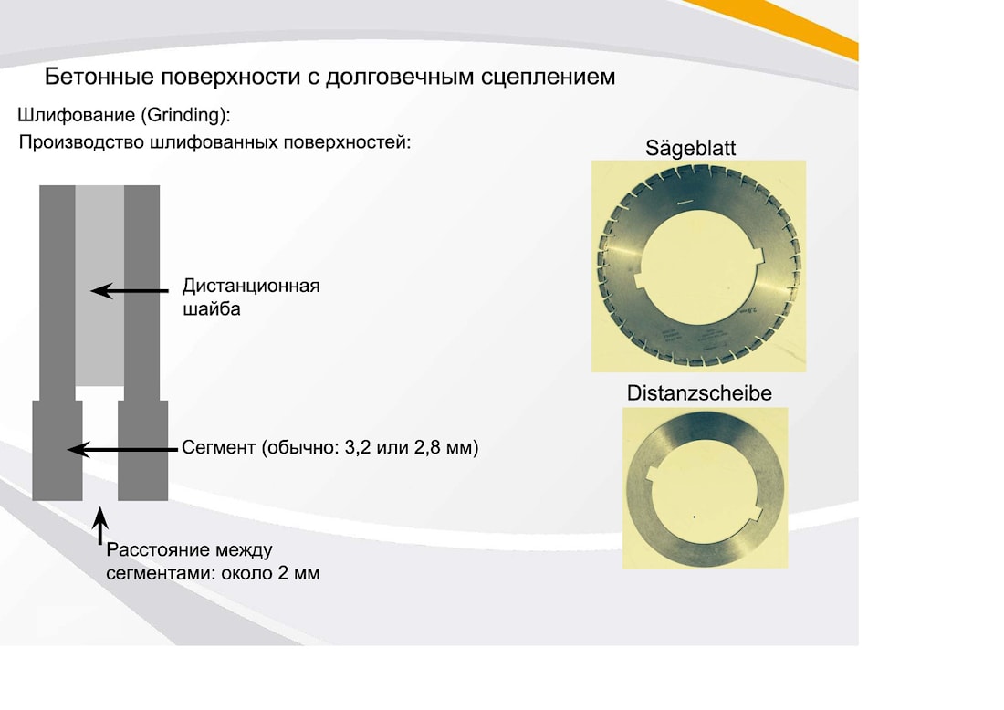 Режущие сегменты, установленные на вал длиной не менее 1 м разделены межу собой промежуточными шайбами. В зависимости от требований дорожных покрытий с помощью выбора инструмента ( размера режущего сегмента) и регулирования расстояния между дисками возможно созание самых различных шлифованных поверхностей ( макротекстур).