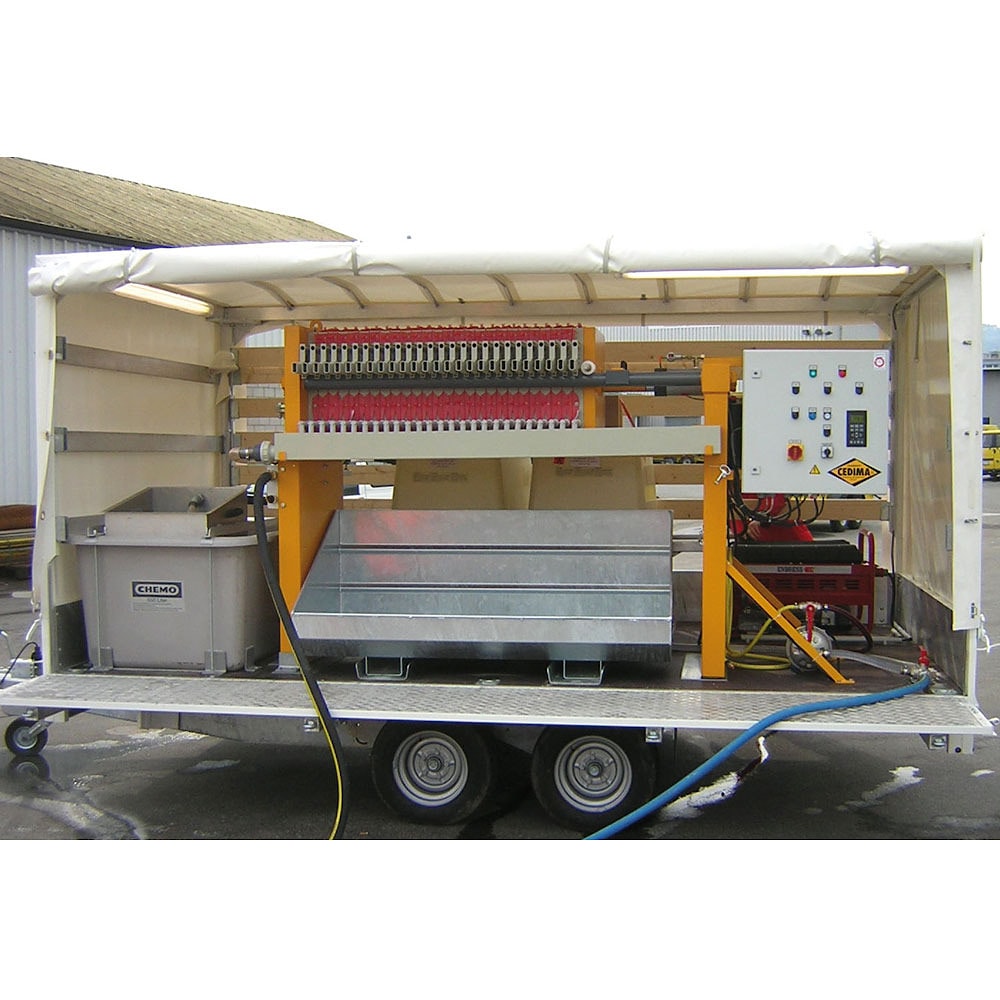 На отдельном тентованном прицепе установленна специальная фильтрующая установка , осуществляющая фильтрацию отходов нарезки, образвованных в результате мокрой нарезке цементобетона алмазным инструментом, с максимальной скоростью обработки до 1500 л/ч. В двух установленных баках может скапливаться более куба (1000л) очищенной воды для циркуляции в процессе нарезки. В процессе нарезки, за счёт работы шламоотсоса нарезчика происходит откачивания бетонной пульпы (шлама), который подаётся в сепаратор, где происходит грубая очистка и разделение на воду и твёрдые частицы отходов. В результате отдельный шлам спрессовывается в твёрдые отходы, а очищенная вода возвращается обратно в режущий контур и участвует в процессе нарезки.