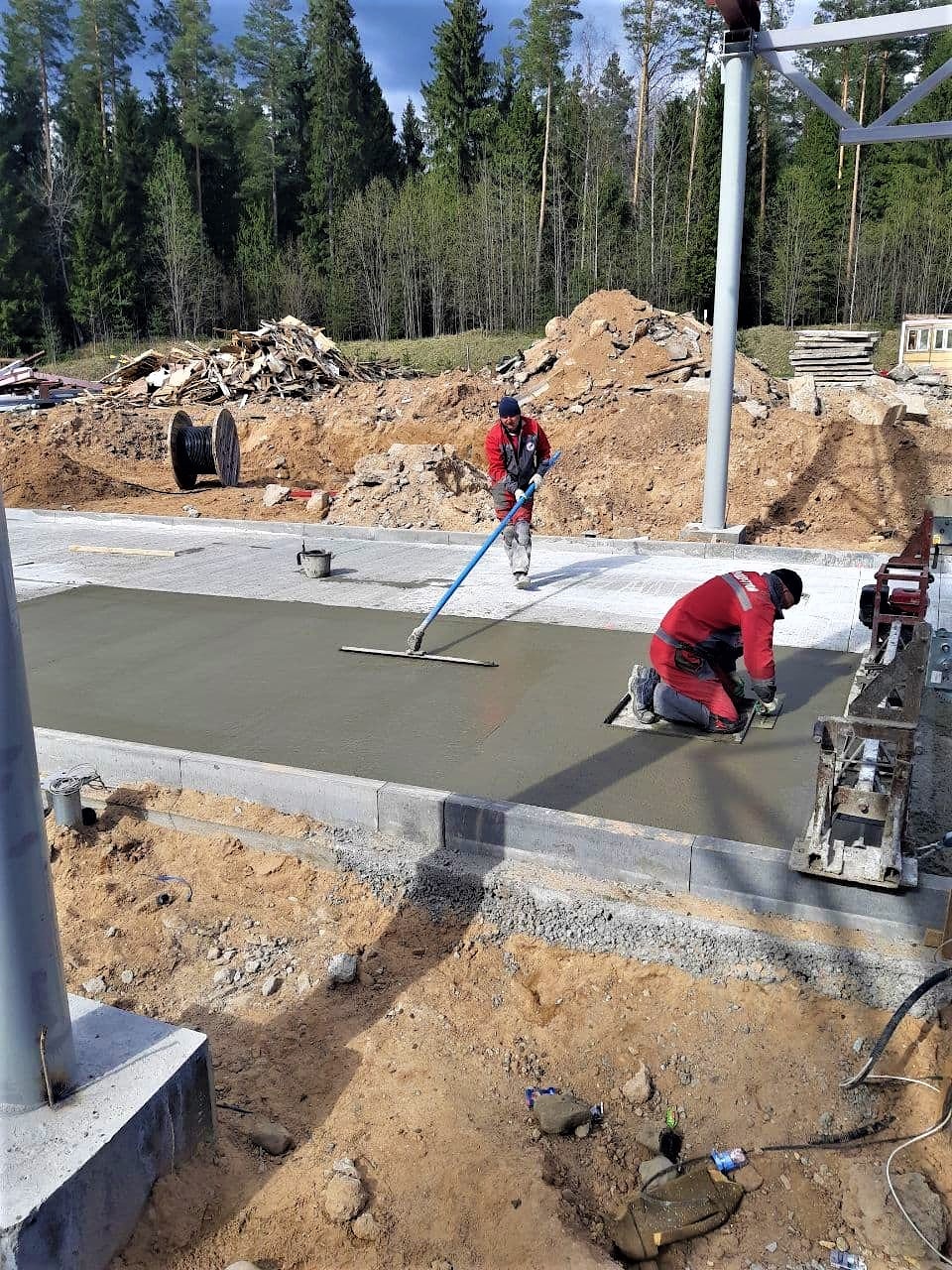 За время работы нами было уложено 10320 м2 цементобетонного покрытия комплекса слоем H = 240 мм из бетона Btb 4.4 F 200. Укладка бетона производилось секционными виброрейками и трубчатым укладчиком. По завершению укладки бетонного покрытия были устроены швы сжатия, расширения и примыкания к бортовому камню. Завершающим этапом строительных работ , выполненных силами компании "Аэродорстрой", стало нанесение на бетонную поверхность гидрофобизирующего состава.