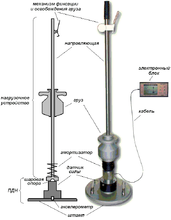 Измерители модуля упругости грунтов и оснований дорог ПДУ-МГ4 «Удар» и ПДУ-МГ4.01 «Удар» предназначены для косвенного измерения модуля упругости грунтов и оснований дорог на основе прямых измерений амплитуды перемещения штампа и ударной силы, действующей на круглый жесткий штамп. Плотномеры ПДУ-МГ4, ПДУ-МГ4.01 предназначены для определения динамического модуля по методу штампа, имитирующему проезд автомобиля по дорожному покрытию. Приборы состоят из нагрузочной плиты, с закрепленными на ней тензодатчиком силы, акселерометром и упругим элементом, штанги с грузом и электронного блока.