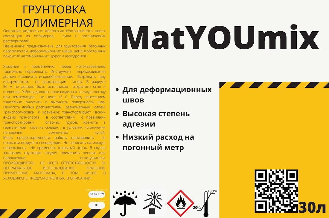 MATYOUMIX -грунтовка полимерная для герметизации деформационных швов и трещин в цементобетонных покрытиях. Праймер MATYOUMIX наносится на стенки деформационных швов и разделанных трещин в цементобетонных покрытиях дорог и аэродромов перед их герметизацией битумно-полимерными герметиками. Применение материала обеспечивает высокое качество адгезии герметизирующих битумно-полимерных мастик с асфальтобетонными и цементобетонными покрытиями и со стальными элементами мостовых сооружений.