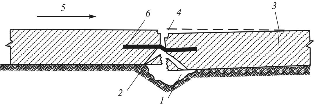 1- деформация основания; 2- разлом; 3- трещина; 4- уступ; 5- направление движение транспортных средств; 6- арматура.