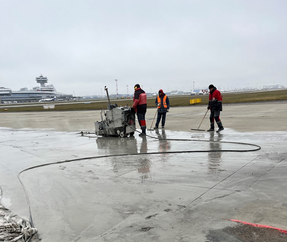 Завершающим этапом ремонта на взлётной полосе было устройство новых деформационных швов. Для компенсации возможных температурных подвижек бетонных плит и обеспечения продольной устойчивости покрытия помимо швов сжатия производилась нарезка швов расширения. Бригада рабочих оперативно выполнила все работы по нарезке и герметизации новых швов. Хочется отметить , что на объекте была задействована вся техника собственного автопарка спецтехники и применены современные качественные материалы.
