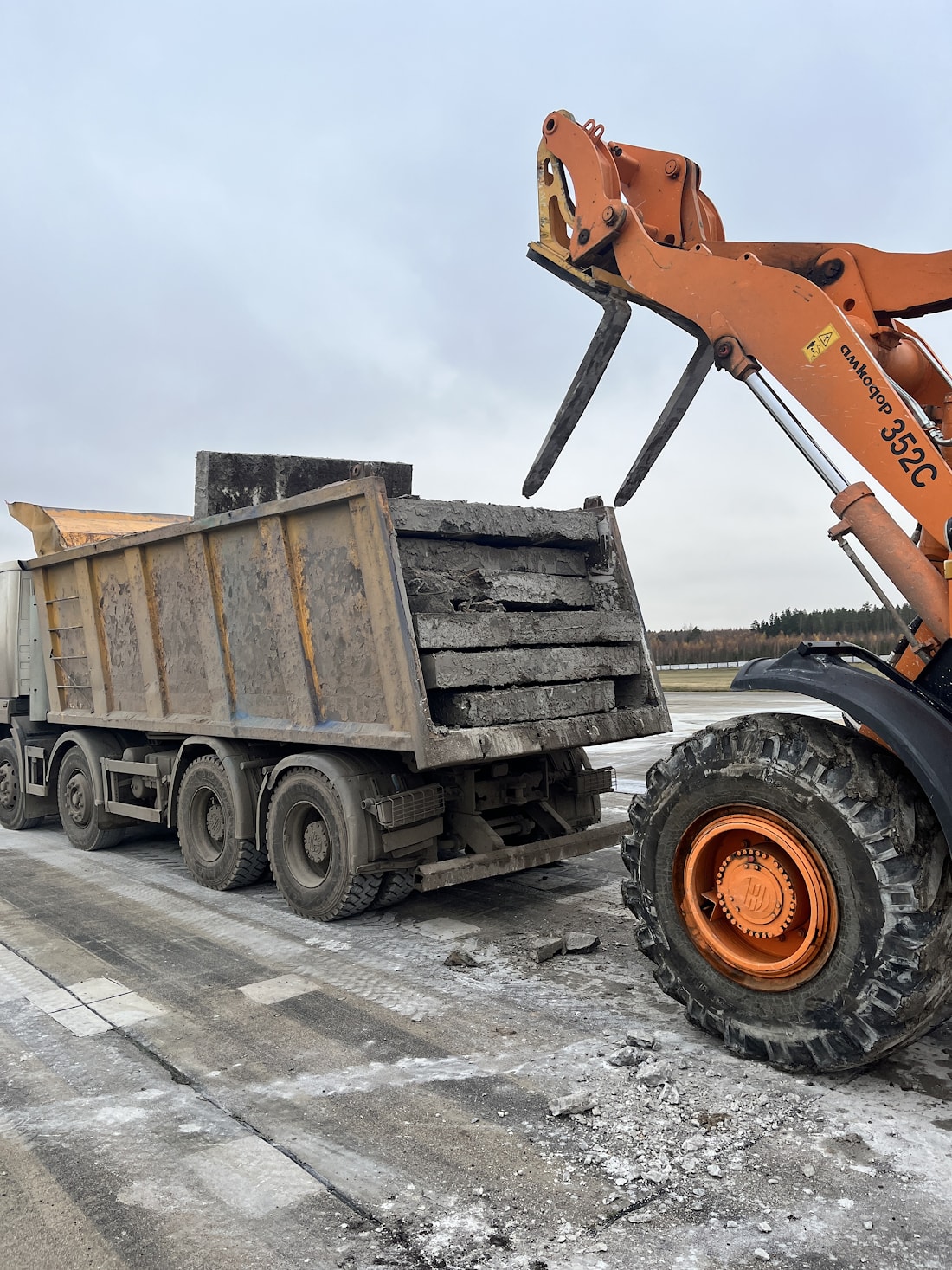К первому этапу работу приступили в ноябре 2022 года. Дефектное покрытие толщиной 24 см было распилено на блоки нарезчиками швов и разобрано при помощи цанговых захватов и автокрана , а также задействовав погрузчики.