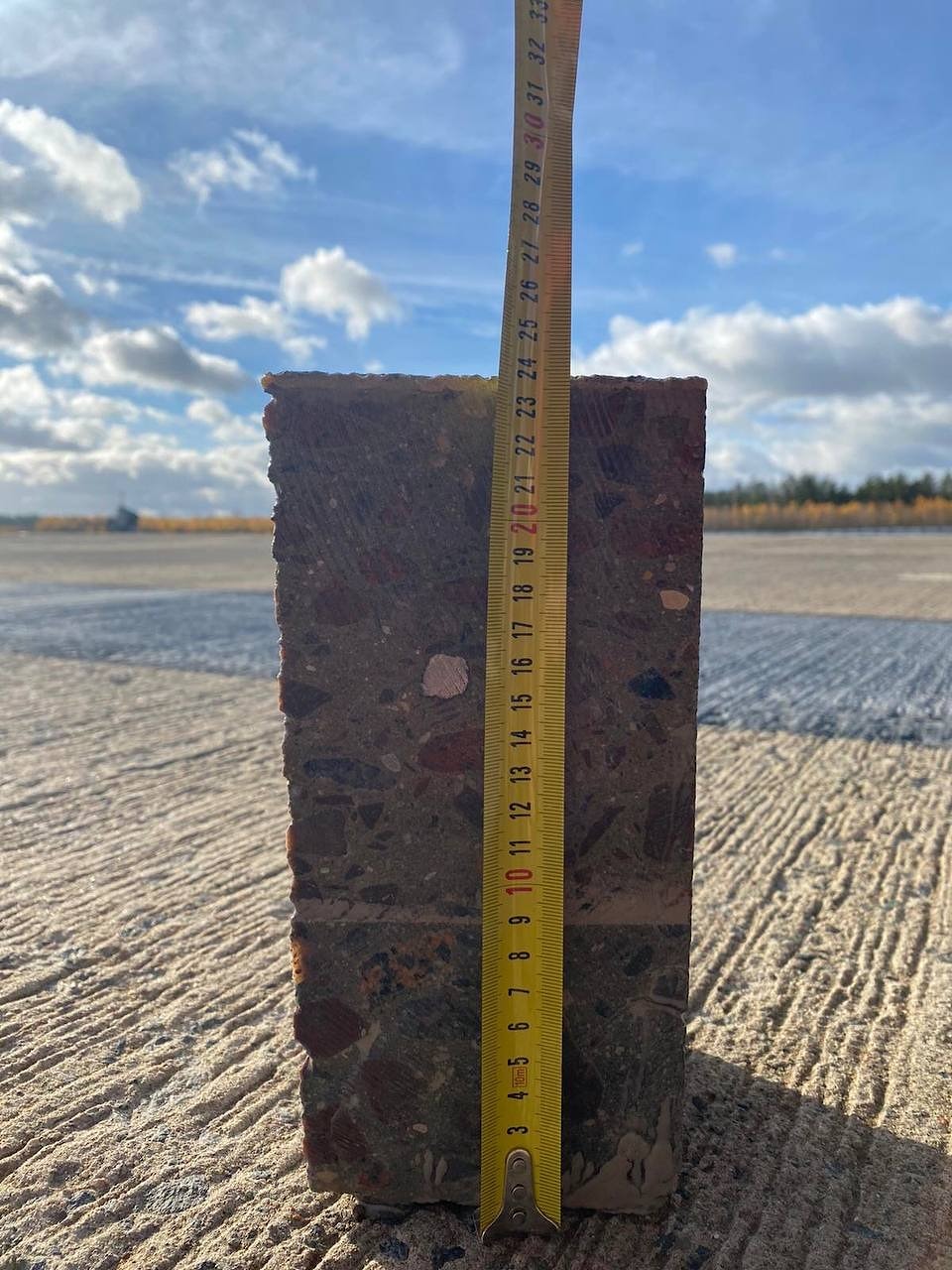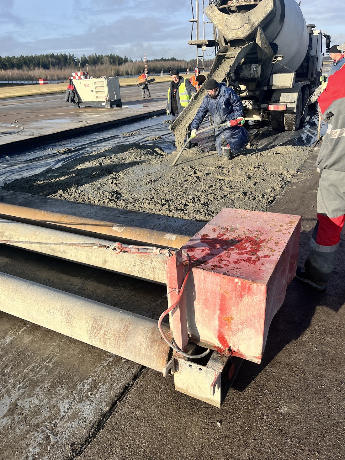 Нарезанные сегменты были погружены в автосамосвалы и вывезены за территорию аэропорта для дальнейшей утилизации. Разобранный участок был очищен от грязи, остатков бетонной пульпы и обломков бетона, была произведена гидроструйная очистка под давлением нижнего подстилающего слоя покрытия. Проанализировав полученную информацию о состоянии нижнего слоя, специалисты ЗАО "СП АЭРОДОРСТРОЙ" совместно с сотрудниками аэропорта пришли к выводу удовлетворительного состояния нижнего слоя покрытия. Было принято решение приступать к бетонированию верхнего слоя покрытия, без вмешательства в слои основания.