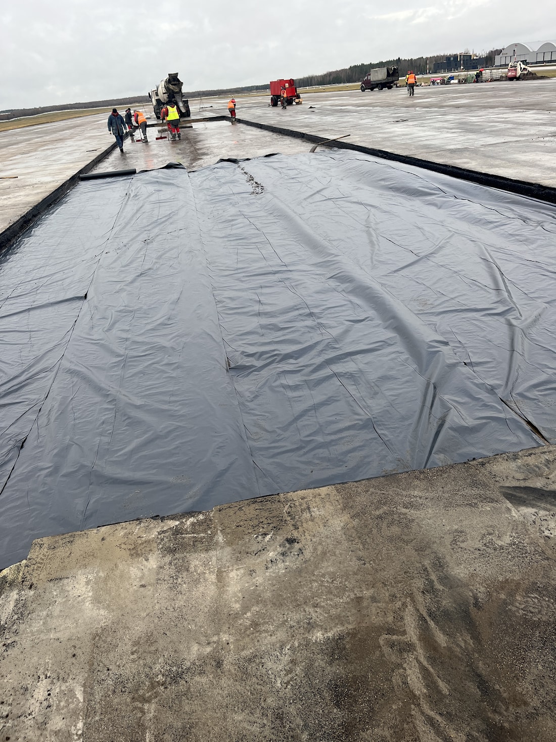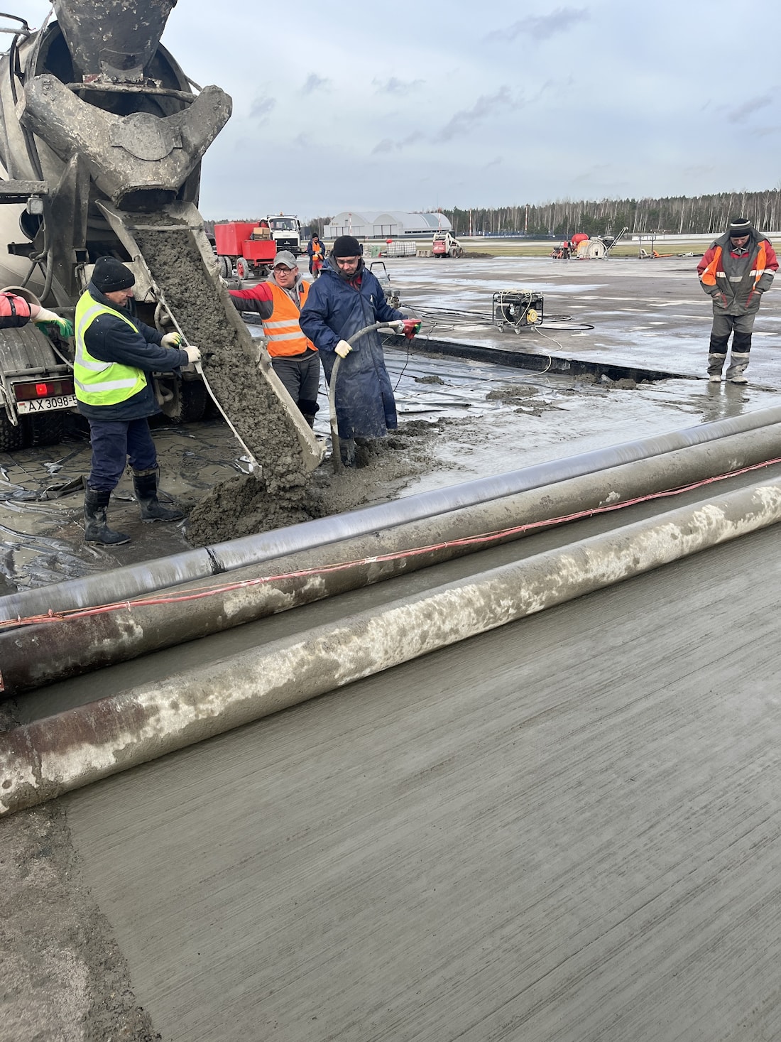 Нашим специалистам предстояла уложить более 1000 м2 нового цементобетонного покрытия слоем 24 см из бетона класса В 35 Btb 4.4 W6 F200. Подготовительные работы перед приёмкой бетона включали в себя следующие этапы : устройство пароизоляции прокладочной из полиэтиленовой плёнки на дно покрытия , устройство обмазочной гидроизоляции торцевых стенок, устройство штыревого армирования по периметру плит из арматурной гладкой стали класса S 240 диаметром 18 мм.