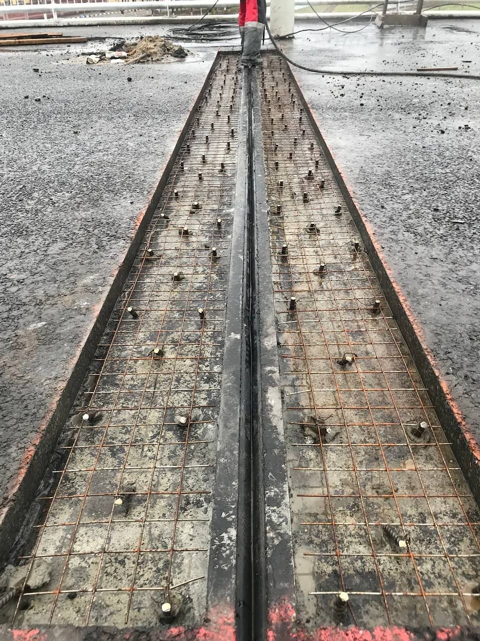 После разборки и очистки переходных зон от асфальтобетона предстояло выполнить комплекс работ по армированию обоймы. Армирующими элементами переходных зон согласно проекта выступала сетка сварная 4*50*50 уложенная с нахлестом в одну ячейку, закрепленная вязальной проволкой к арматурным анкерам из арматуры S 500 диаметром 12 мм. Анкеры были установлена в шахматном порядке с шагом армирования 200 мм из расчёта 25 шт на 1 м2.