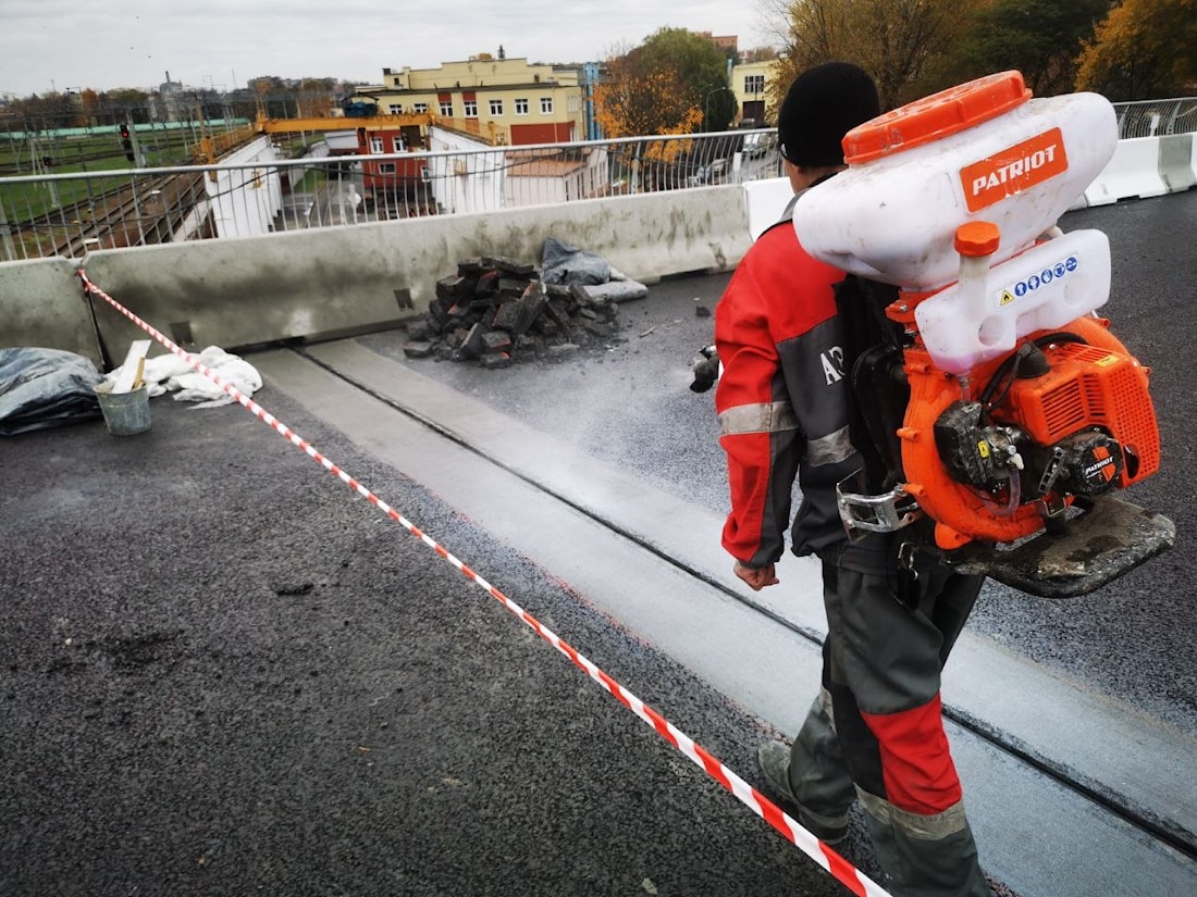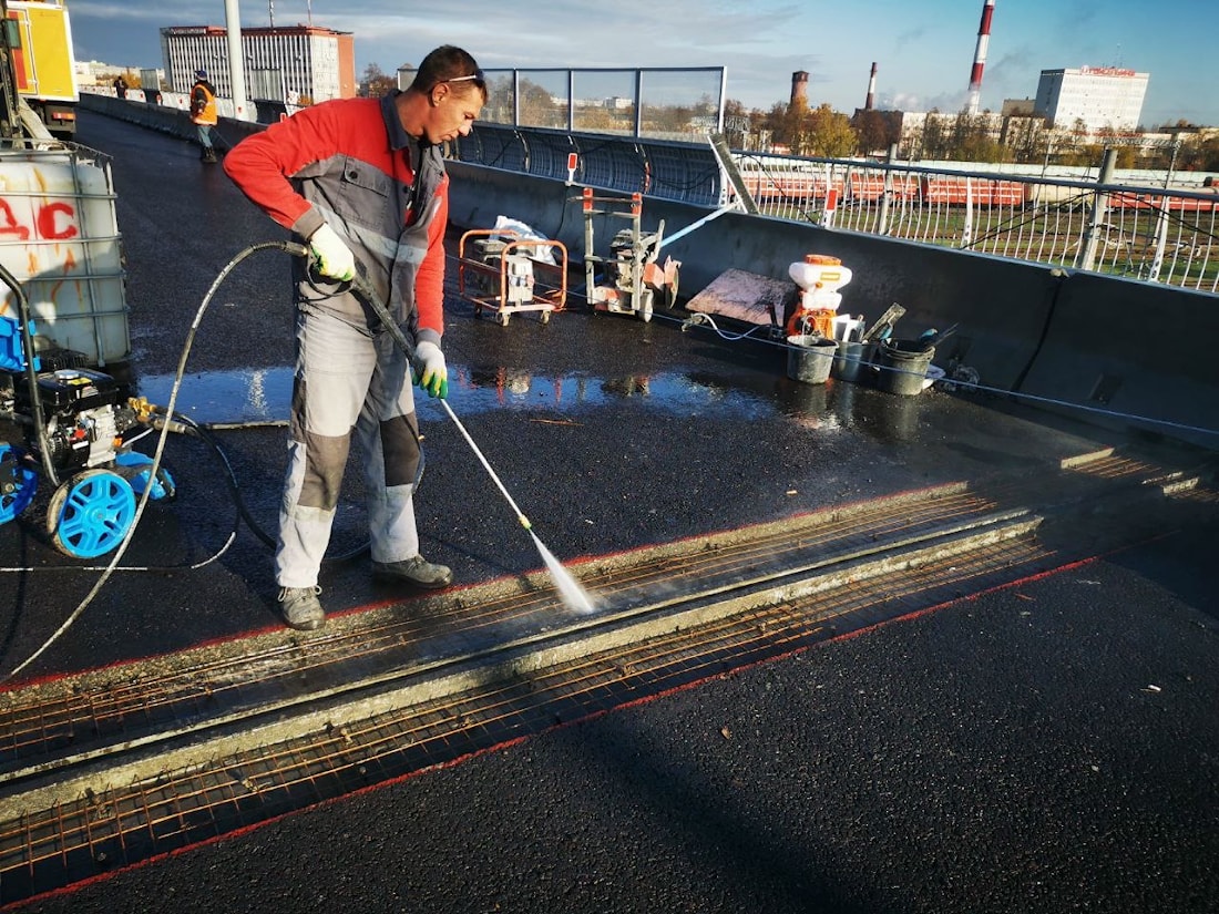 После завершения работ по армированию бетонная поверхность подвергалась гидроструйной очистке водой под давлением с последующей продувкой сжатым воздухом для удаления излишки воды. Далее на очищенную бетонную поверхность наносится специальный грунтовочный состав для лучшего сцепления ремонтного материала с существующим бетонным покрытием пролетного строения путепровода.