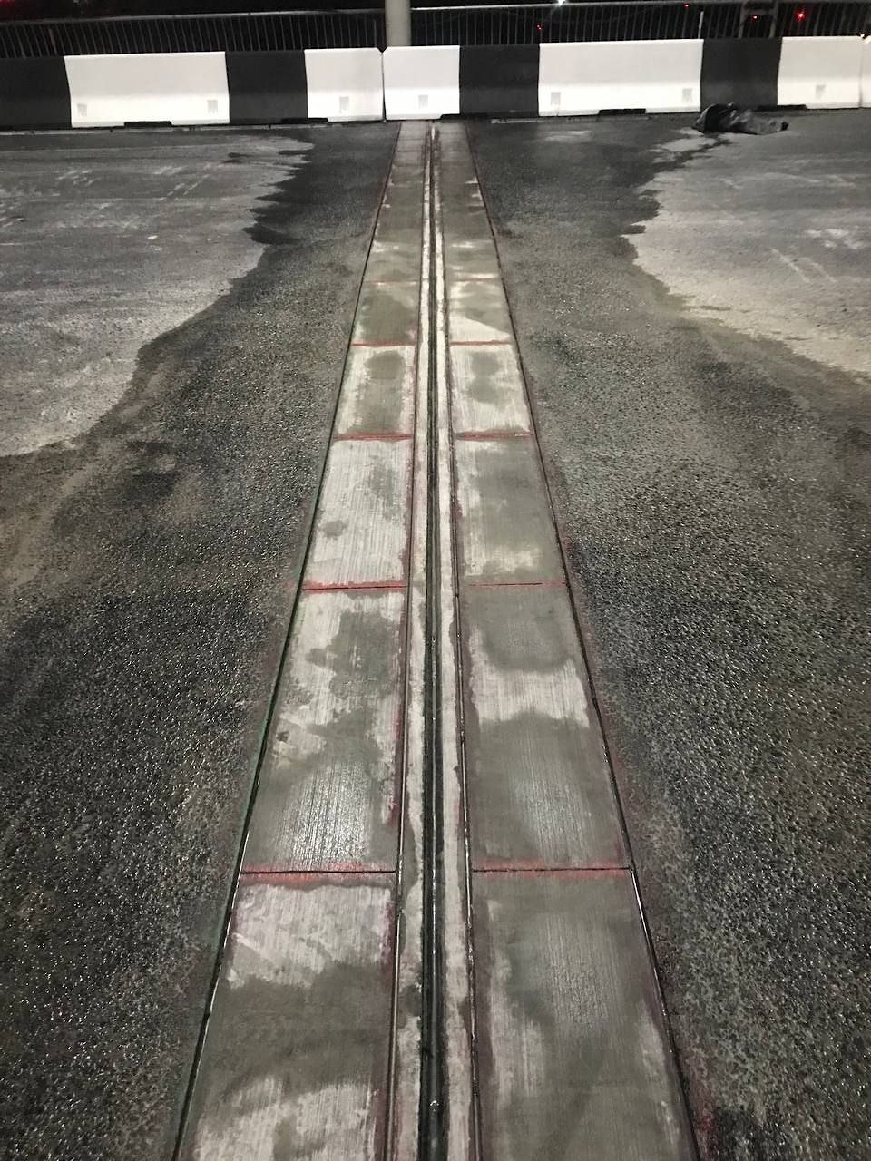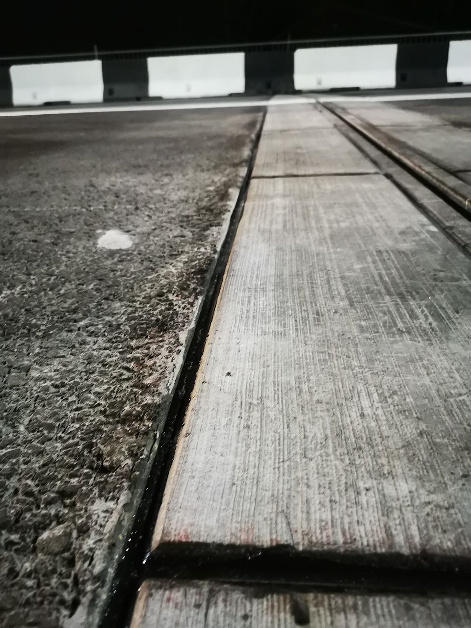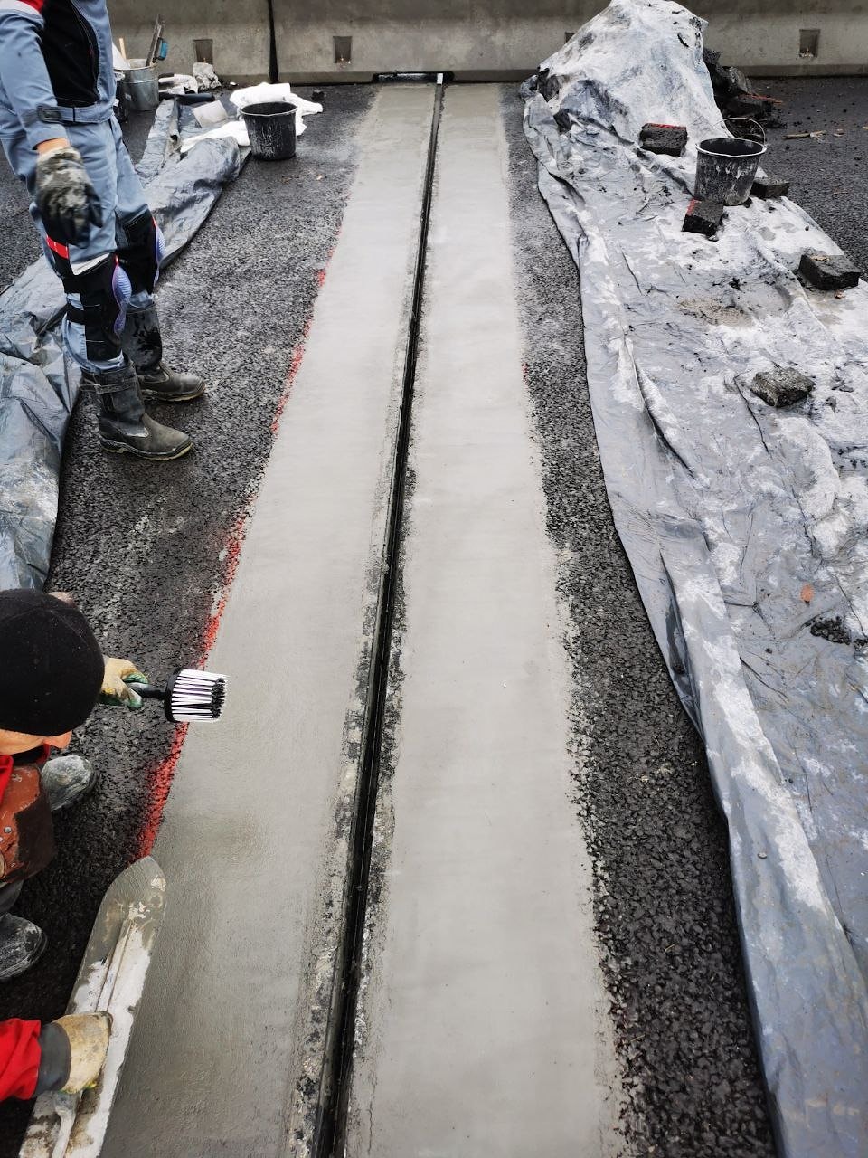 Завершающим этапом ремонта был комплекс работ по нарезке камеры швов сжатия и швов сопряжения ремонтного материала с асфальтобетонным покрытием по периметру переходной зоны. По завершению нарезки швов был выполнен цикл подготовительных работ для герметизации. Во всех швах была устроена фаска под углом 45 ° с двух сторон, произведена очистка полости жгутовыми дисковыми щётками. Для повышения качества адгезии мастики к бетону и асфальту была применена грунтовка MATYOUMIX.