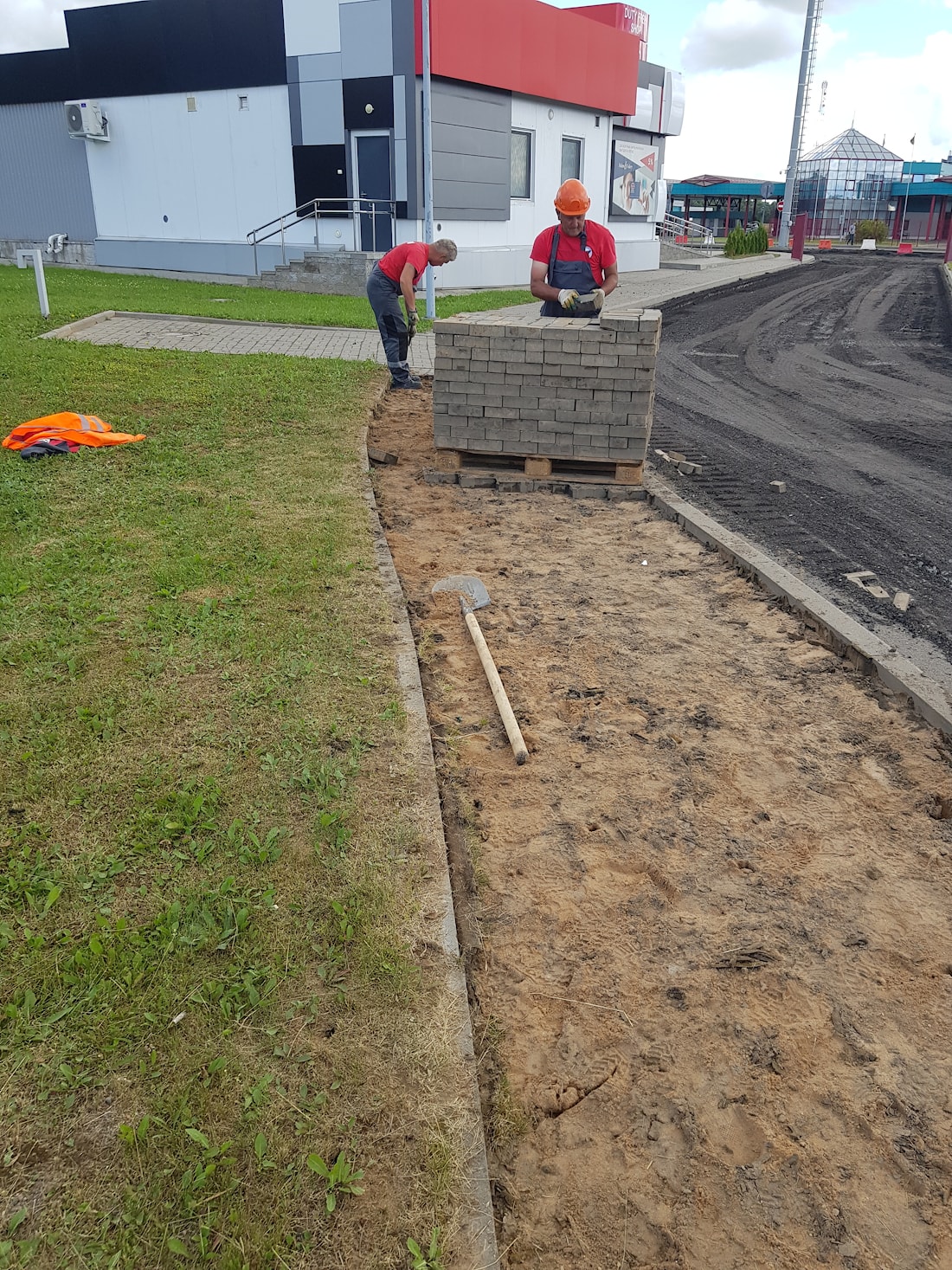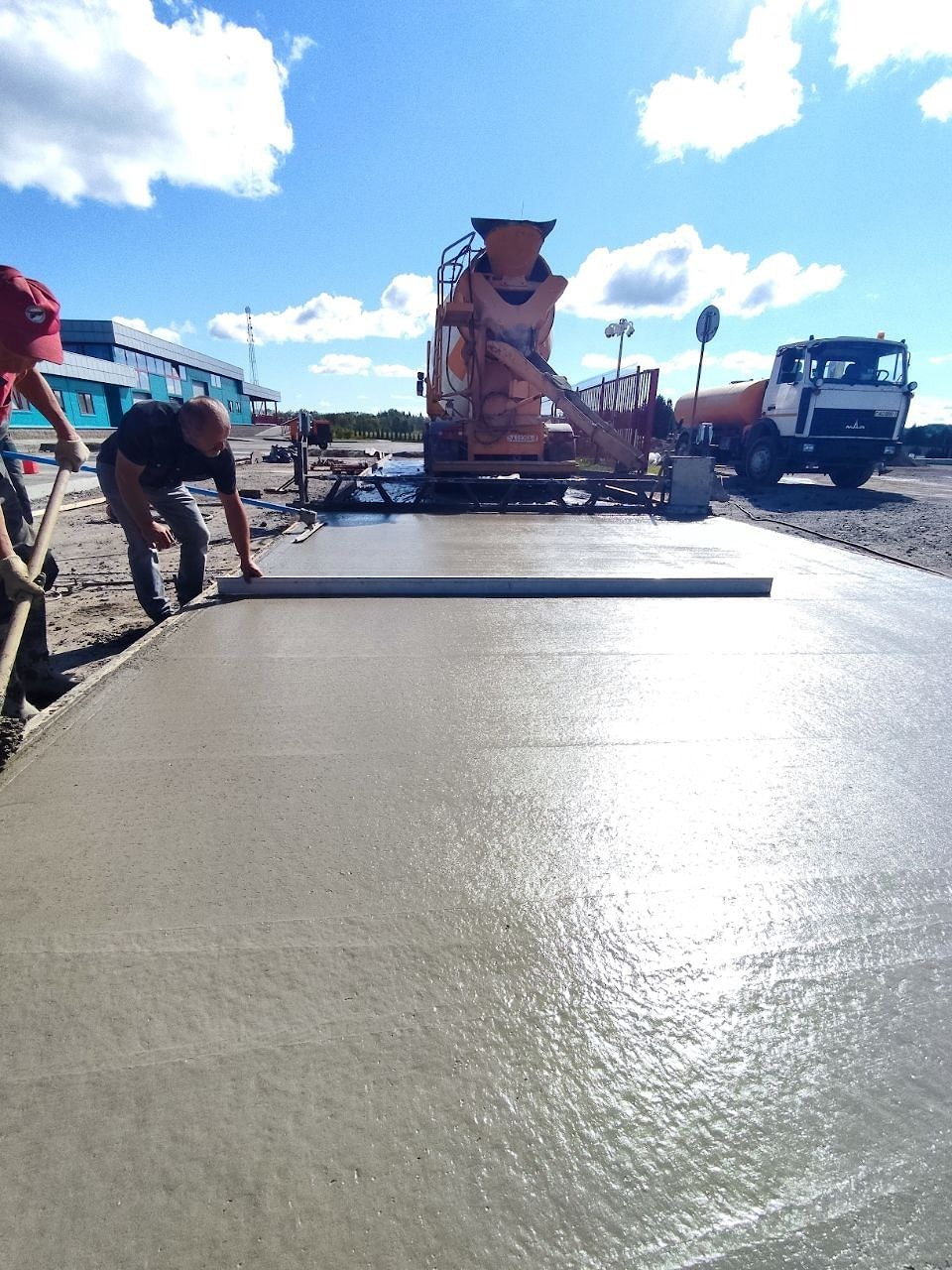 - устройство 12000 м2 цементобетонного покрытия в комплексе с подготовкой основания ; - нарезка и герметизация деформационных швов в покрытии более 8000 мп. - устройство тротуаров и пешеходных дорожек из мелкоштучной плитки - 1000 м2 - установка бортового камня в объеме 500 м.п.;