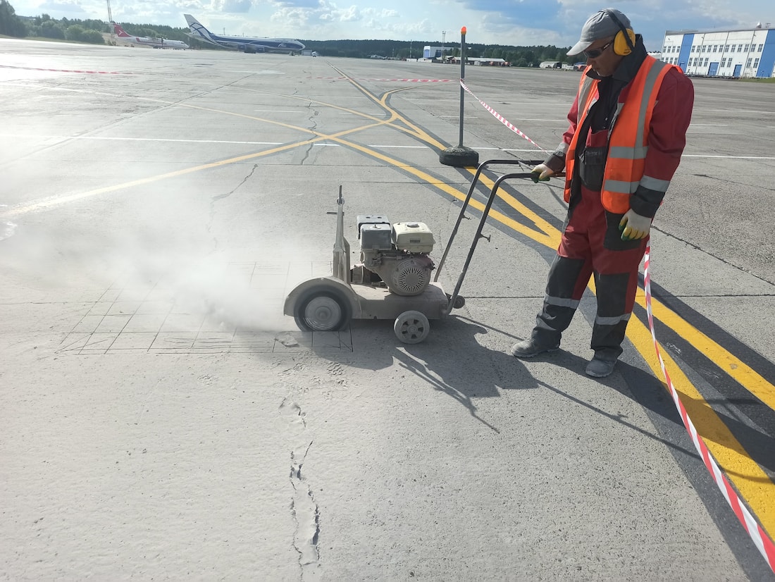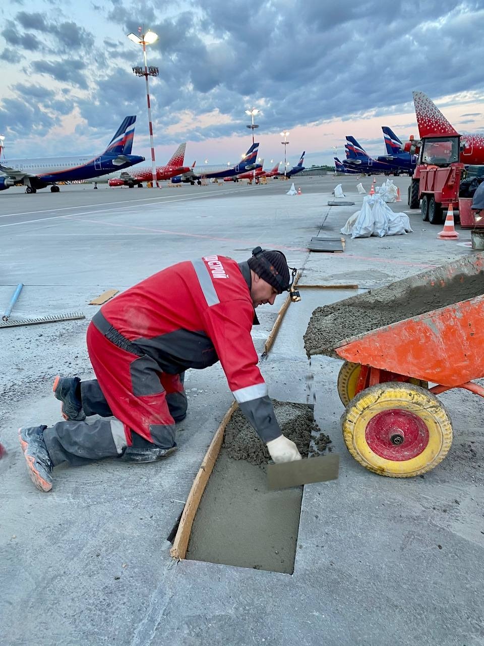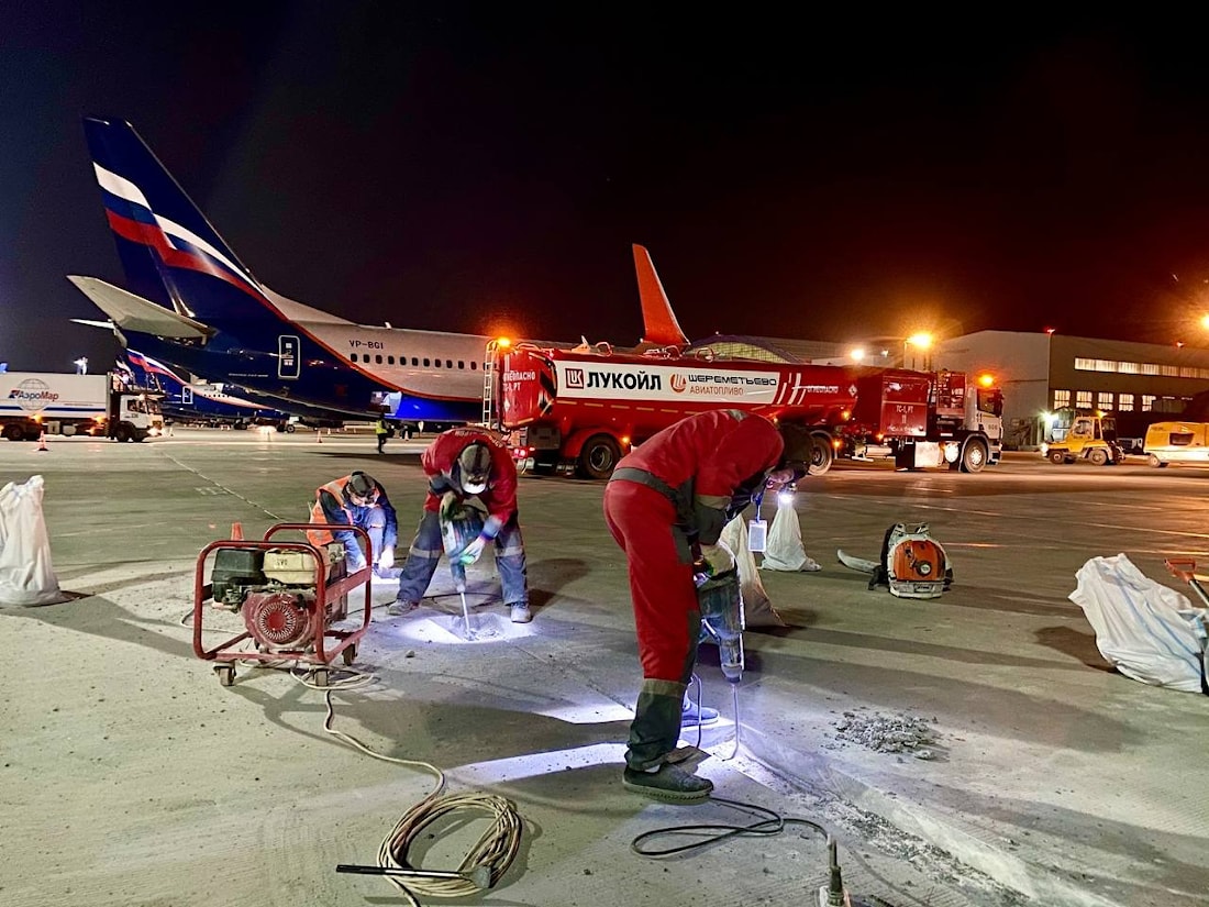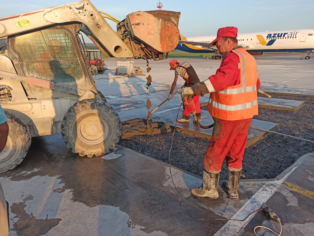 Громадный опыт в производстве подобного вида работ ЗАО «СП АЭРОДОСТРОЙ» приобрело при выполнении работ по ремонту сколов, шелушения в аэропортах РБ и РФ. В минимально отведенные для производства работ «окна» (менее 4 часов), выполняется не только демонтаж покрытия, а укладка смеси, с набором необходимой прочности в 20 МПа покрытия для взлета-посадки воздушных судов.